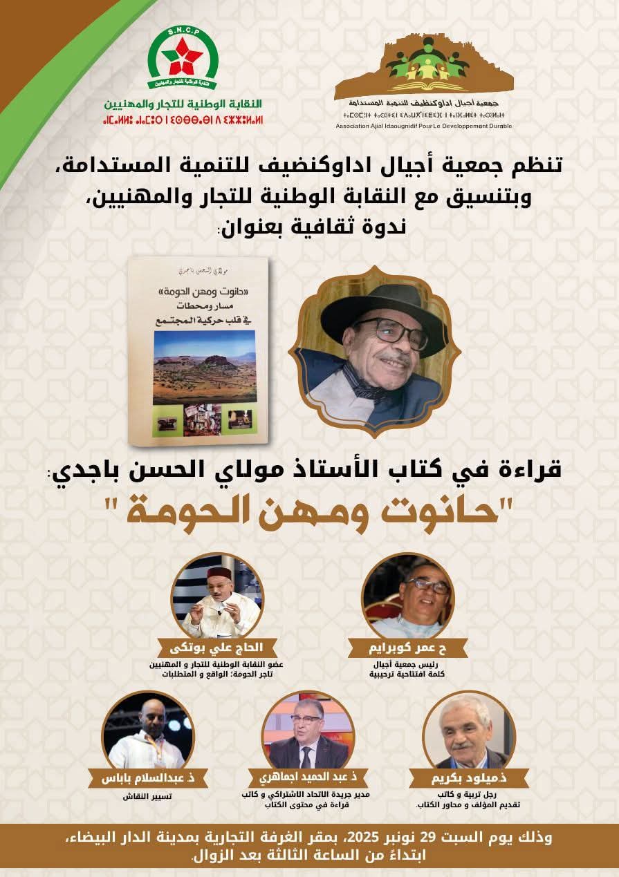 “حانوت ومهن الحومة ” لمؤلفه باجدي مولاي الحسن يحط الرحال بغرفة التجارة والصناعة والخدمات بالدارالبيضاء في ندوة مفتوحة من تنظيم جمعية اجيال اداوكنظيف للتنمية المستدامة بتنسيق مع النقابة الوطنية للتجار والمهنيين بالدارالبيضاء يوم السبت 29 نونبر 2025 ابتداء من الساعة الثالتة زوالا.