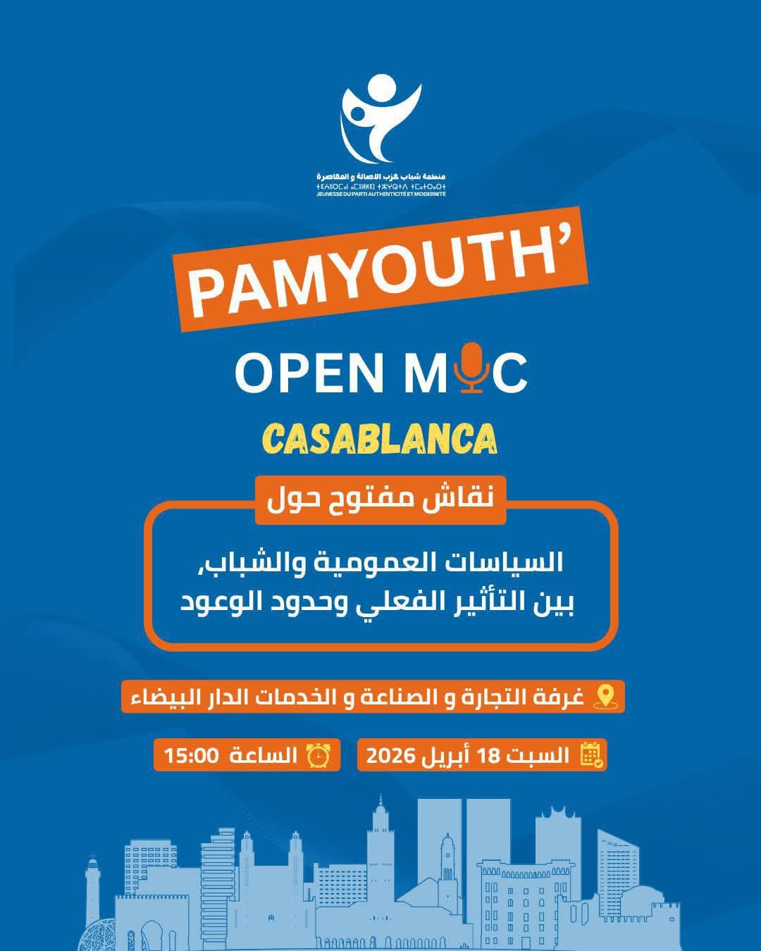 في سياق يتزايد فيه النقاش العمومي حول فعالية السياسات الموجهة لفئة الشباب، تحتضن مدينة الدار البيضاء لقاءً نقاشياً مفتوحاً ضمن فعاليات PAM Youth Open، تنظمه منظمة شباب حزب الأصالة والمعاصرة بجهة الدار البيضاء–سطات، تحت عنوان لافت: “السياسات العمومية والشباب: بين التأثير الفعلي وحدود الوعود”.